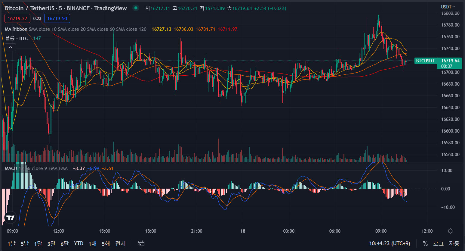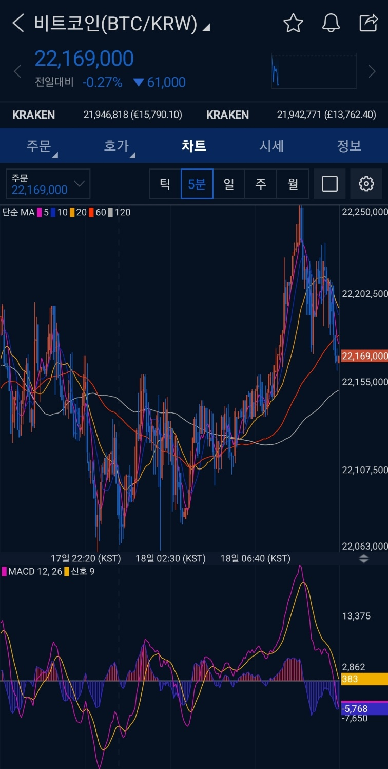 아래는 업비트와 트레이딩뷰에서의 MACD 모습입니다.