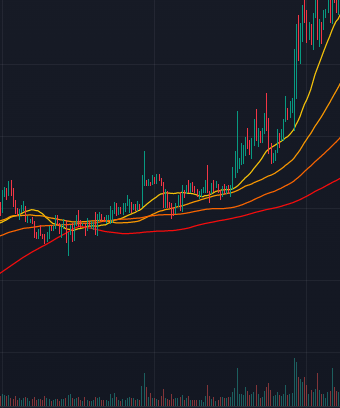 앞의 횡보장에서 점차 강세로 확정되면서, 이동평균선은 긴 주기가 아래에, 짧은 주기가 위에 위치하는 정배열을 보이게 됩니다.